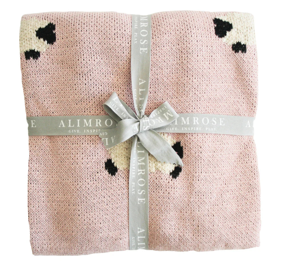 A gorgeous 100% cotton knit baby blanket featuring little woolly leaping sheep. Adorable!