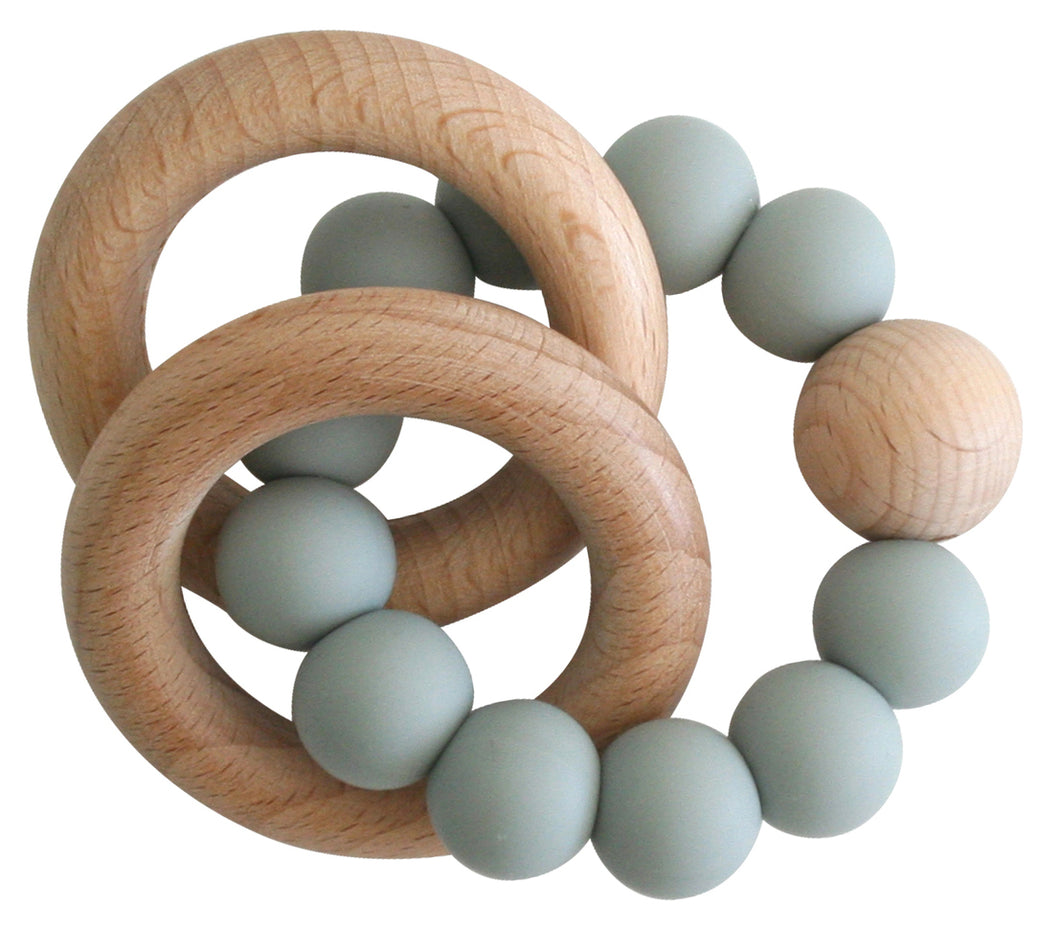 Smooth natural beechwood teether ring set in sage green colour. Features easy to grab shape with soft silicone beads to massage sore gums. Modern and practical! Clean with damp cloth, warm soapy water, rinse clean and pat dry. Comes in a cotton gift bag.