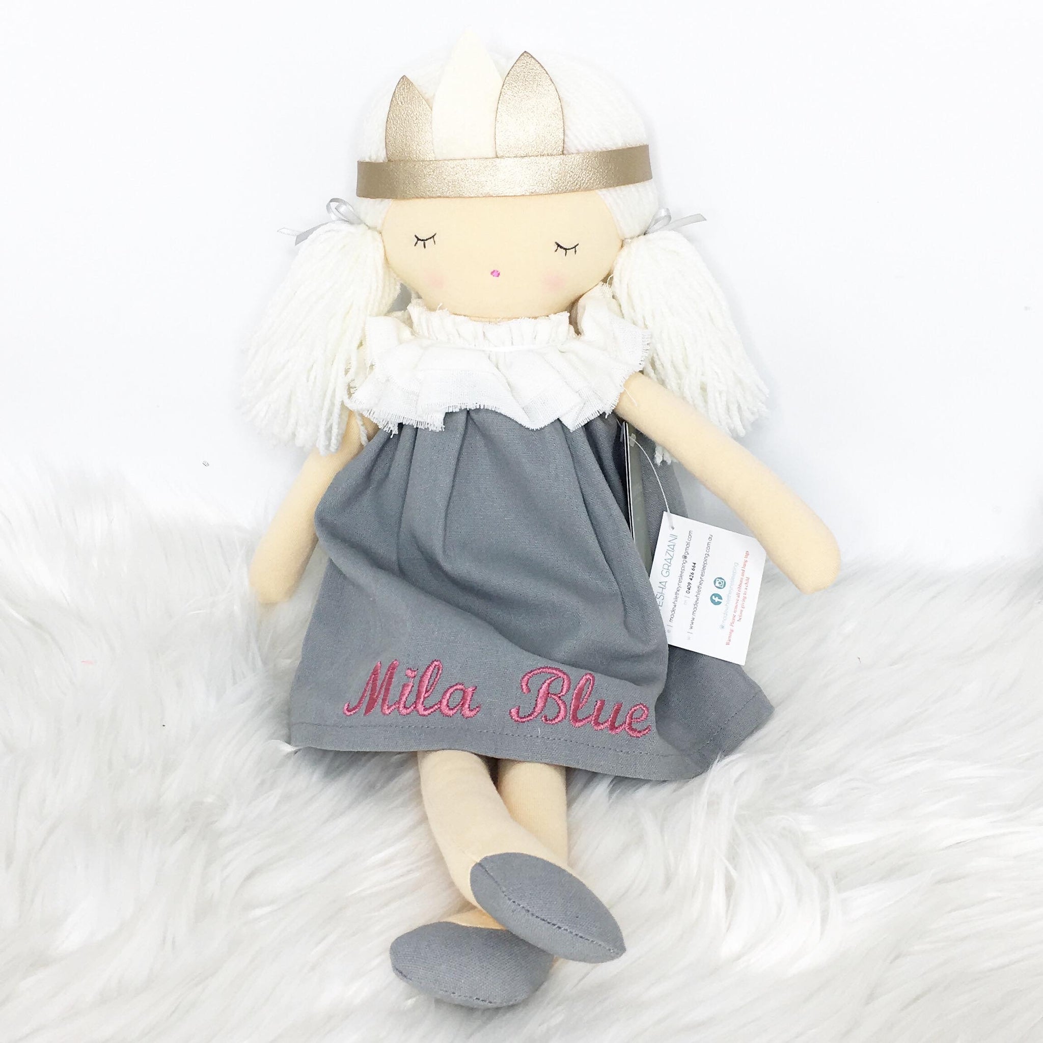 Personalise the doll's dress with a single name. Please enter the name in the text box above, with your thread colour preference and font (see image). A design proof will be emailed to you for approval prior to any stitching being done.