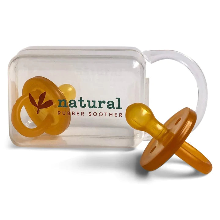 Round Natural Rubber Soother(s) packaged in a reusable case allowing for convenient and hygienic storage. The round or cherry shape teat, large shield and soft natural rubber makes it the perfect dummy for breastfed babies, but all babies seem to love the Natural Rubber Soother round dummy.
