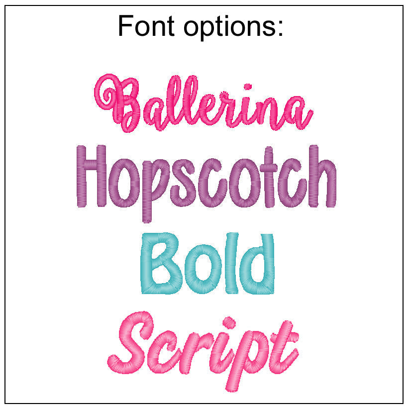 Personalise the doll's dress with a single name. Please enter the name in the text box above, with your thread colour preference and font (see image). A design proof will be emailed to you for approval prior to any stitching being done.