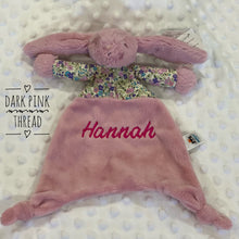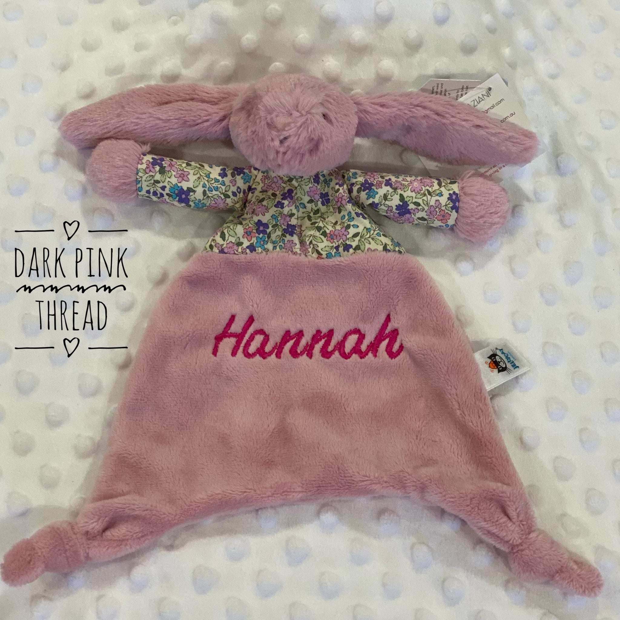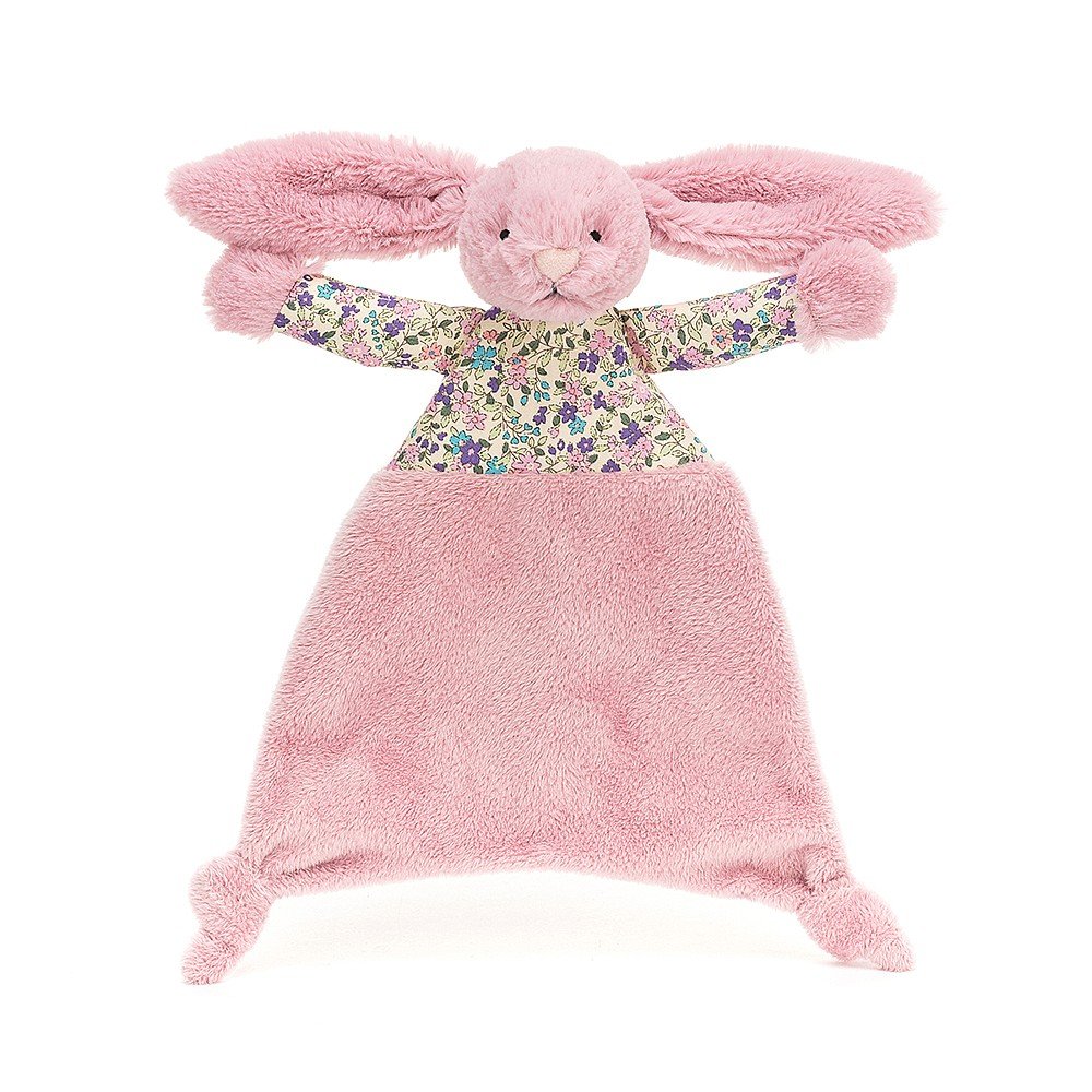 Tulip Blossom bunny comforter is a baby sensory delight in a beautiful shade of pinky-purple featuring floral ears and top with pink, purple, blue and green tones, and knotted chewable feet.