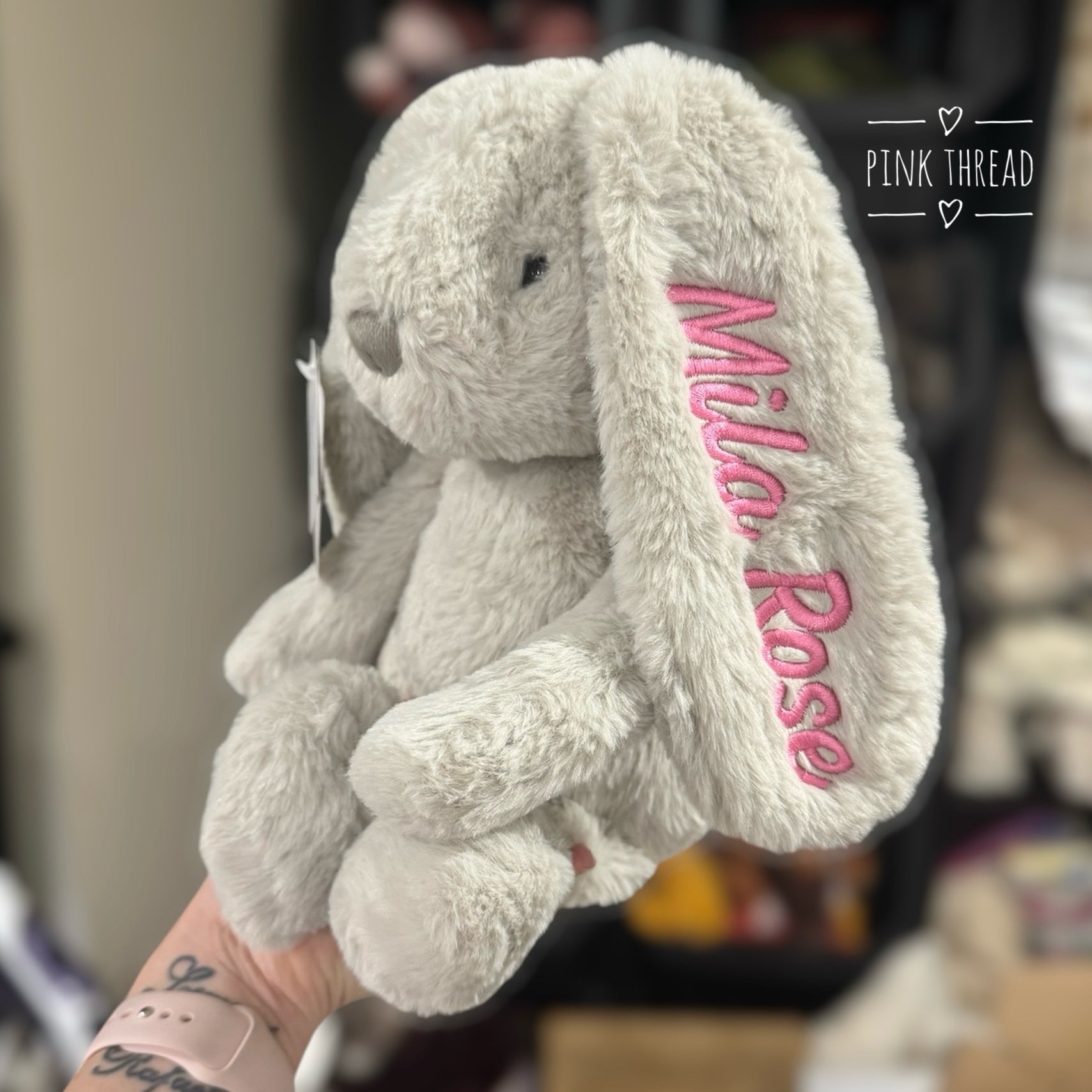 Each bunny can be personalised with a single name on one ear OR both ears. A maximum of 10 characters (inc spaces) per ear is best. Choose your font and thread colour. Please advise the name(s), font and colour in the text box above. A design proof will be emailed to you for approval prior to stitching. **Please note that the stitching goes straight through the ear. You will see reverse stitch on the underside of the ear.**